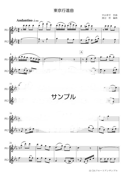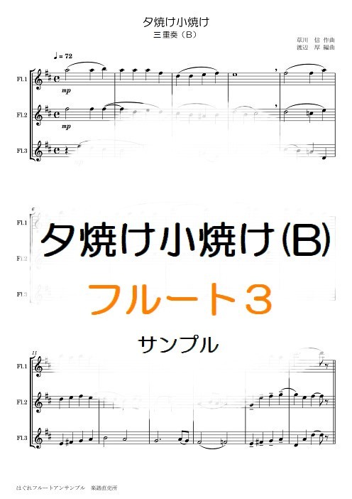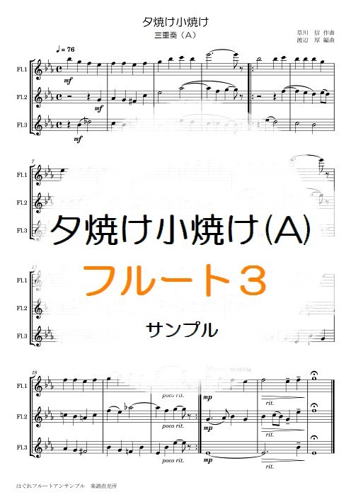 | 1stフルートはほんの少し難しいかも。でも楽しいかな。 信越本線碓氷峠の車窓から見える紅葉を歌ったものらしい。 つまり・・・「鉄道メドレー」とかと組み合わせられる鉄道系の曲だったりするのです。 演奏時間 1分40秒 ※こちらの楽譜は、以下の詰合せセットにも収録されています。 ■詰合せ 童謡唱歌 フルート2重奏・4重奏 ■詰合せ 童謡唱歌 フルート3重奏・4重奏 →楽譜はこんな感じ(1ページ目の画像) ♪試聴 →ご購入はこちらから |