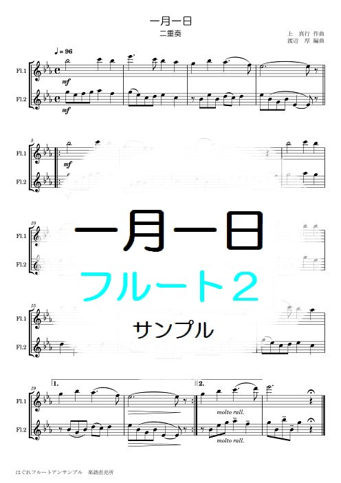 | 繰り返しをすると、6番まで演奏することになります。間奏付き。 繰り返さなければ、3番までで、程良い長さです。 もちろん、オリジナル通り374番まで繰り返してもいいですよ。 ※こちらの楽譜は、以下の詰合せセットにも収録されています。 ■詰合せ 童謡唱歌 フルート2重奏・3重奏 ■詰合せ 童謡唱歌 フルート2重奏・4重奏 →楽譜はこんな感じ(1ページ目の画像) ♪試聴 →ご購入はこちらから |